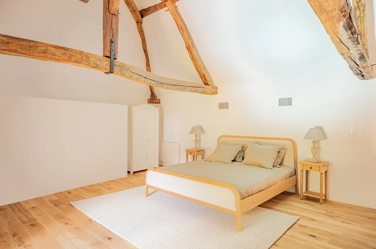 Située à l’étage de la Maison de la Piscine, la chambre spacieuse et lumineuse, offre l’une des plus belles vues sur le domaine. Face au Château et au-dessus de la piscine, elle permet de loger deux personnes très confortablement et dans un cocon d’intimité. Les reflets de la piscine immergent chaque pièce d’une lueur bleutée et vous transportent, le temps d’un séjour, dans une atmosphère qui invite à la déconnexion et au bien-être.